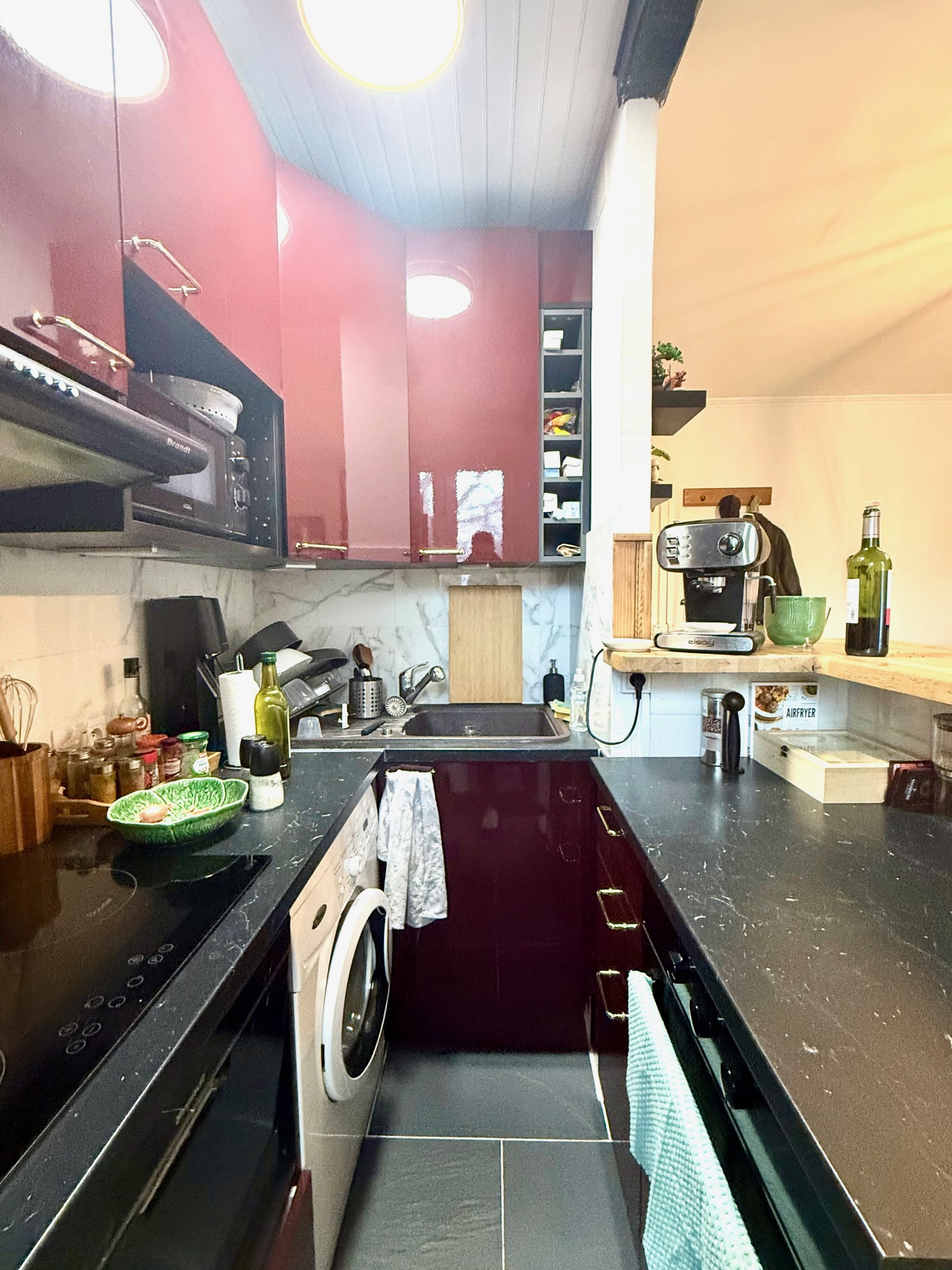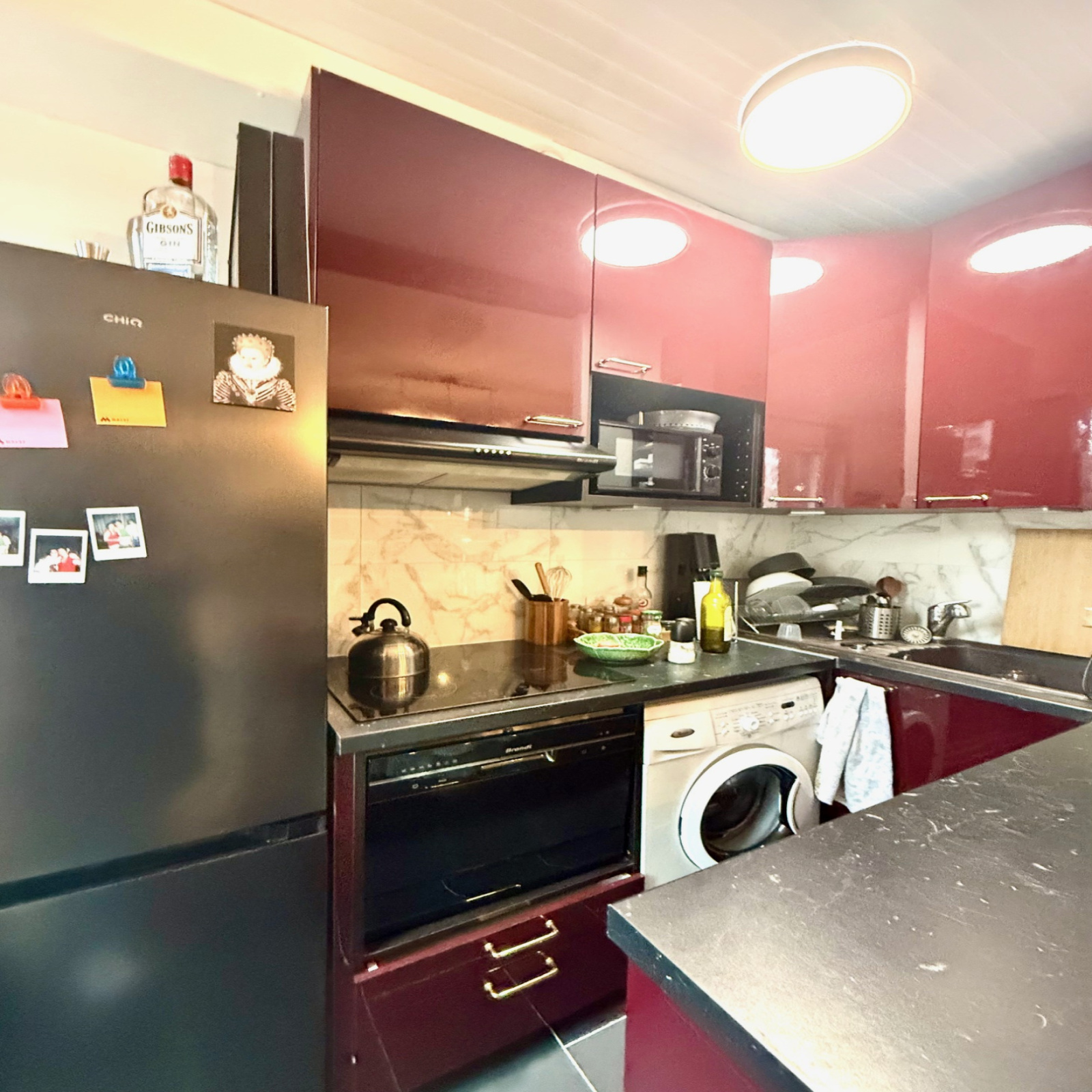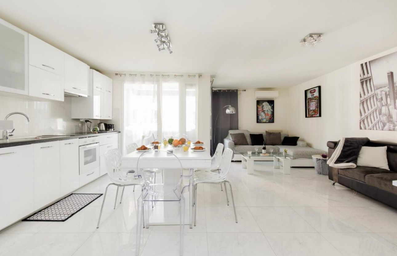 L’espace de vie ouvert sur une cuisine américaine moderne crée un lieu convivial, idéal pour recevoir ou profiter de moments de détente.
